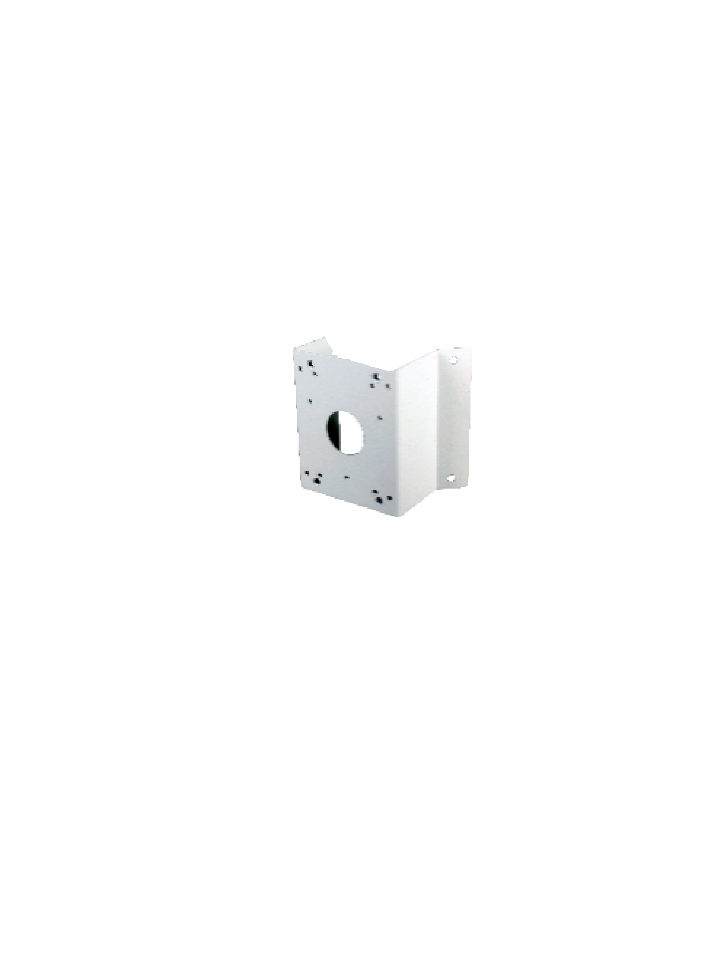 Soporte metálico en color blanco, diseñado para instalación de cámaras en esquinas exteriores. Fabricado en material resistente para soportar temperaturas extremas de -40°C a +70°C y hasta 90% de humedad relativa. Ideal para instalaciones seguras y discretas en exteriores.